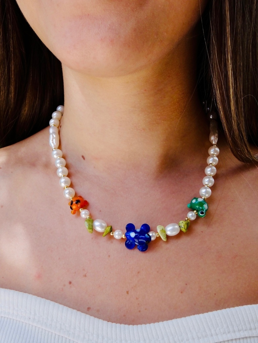 Colar curto de pérolas em formatos diferentes, com pequenas tartarugas coloridas de acrílico. Possui bolinhas douradas entre as pérolas e acabamento dourado também.