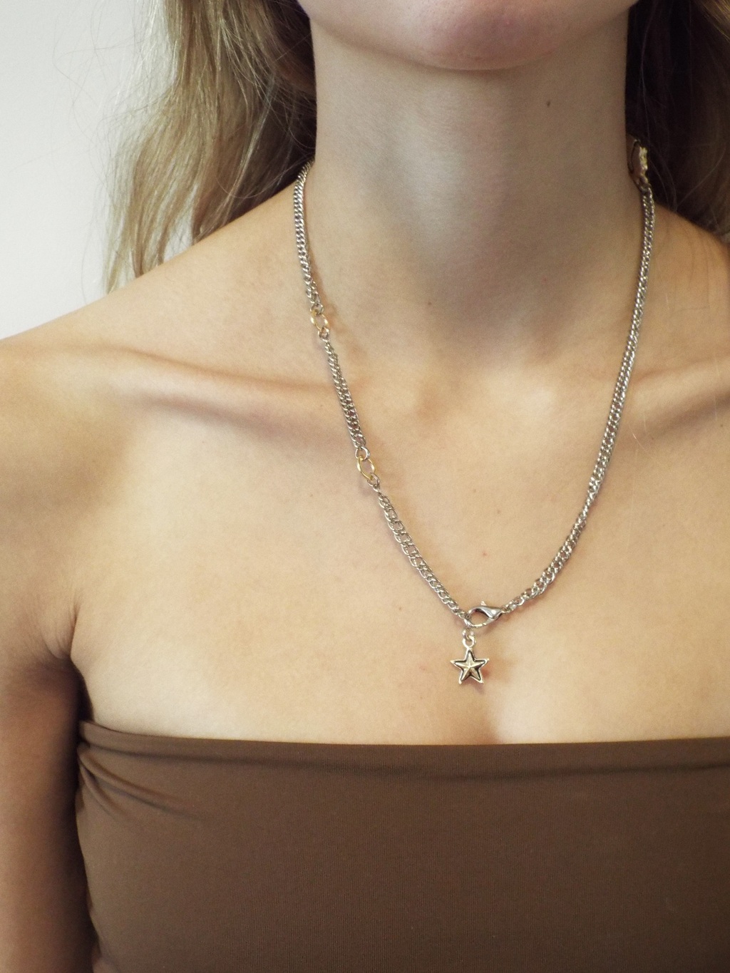 Colar de tamanho médio com mix de banhos prata e dourado. Possui pingente de bota e uma pequena estrela. O colar não possui extensor mas em seu comprimento tem duas argolas onde é possível regular o tamanho.