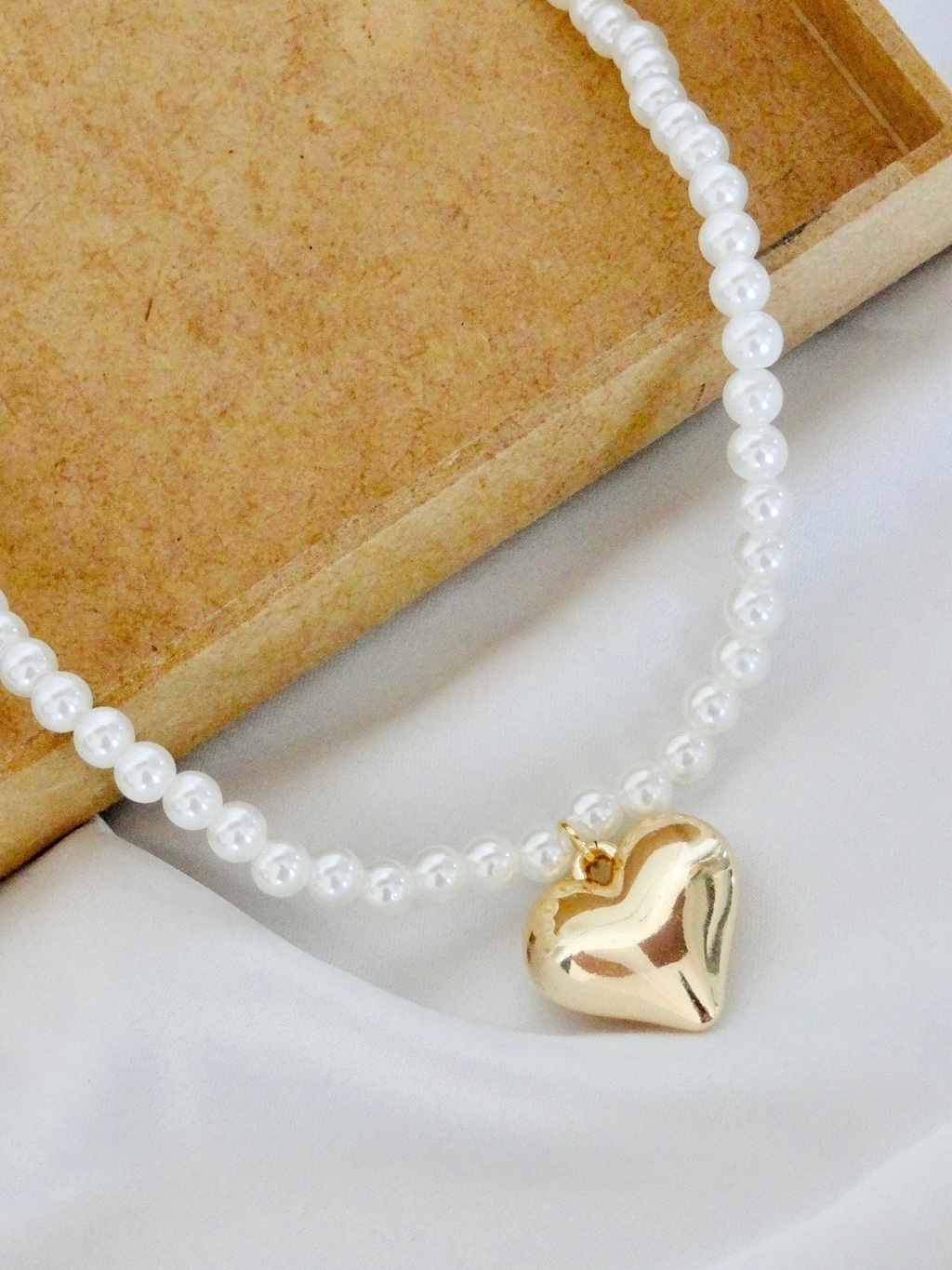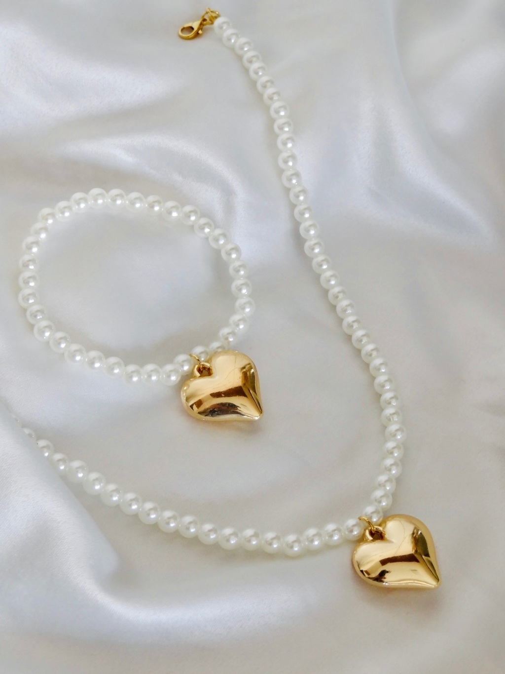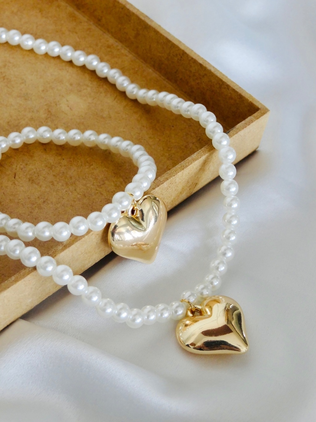 Conjunto de colar e pulseira. Pérolas redondas combinadas com pingentes de coração dourado gordinho, em um conjunto que une delicadeza e personalidade. Ideal para quem busca um acessório que faça a diferença com um toque de sofisticação.